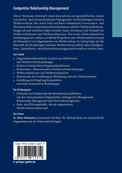 Oliver Neumann entwickelt einen innovativen und ganzheitlichen Ansatz zum kosten- und nutzenorientierten Management von Beziehungen zwischen Wettbewerbern. Der Autor leitet auf Basis vorhandener Governance- und Theoriemodelle ein innovatives Koordinationsmodell für Wettbewerberbeziehungen ab und modelliert dabei erstmals Arten, Strukturen und Verläufe von Wettbewerbskosten und Wettbewerbsnutzen. Der in der Arbeit präsentierte Gestaltungsansatz umfasst sowohl die Perspektive eines Wettbewerbers als auch die Perspektive von Organisatoren von Wettbewerben. Es wird gezeigt, wie die Intensität der Beziehungen zwischen Wettbewerbern mittels eines Konfigurations-, Interaktions- und Infrastrukturmanagements beeinflusst werden kann.