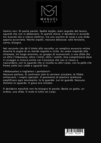 Uomini veri. Di poche parole. Spalle larghe, mani segnate dal lavoro, sguardi che non si abbassano. In queste storie, il desiderio si accende tra muscoli tesi e silenzi elettrici, tra uno scontro di corpi e una sfida appena accennata. Niente orpelli, nessuna dolcezza: solo tensione, carne, bisogno.Nel racconto che dà il titolo alla raccolta, un semplice annuncio online diventa la soglia di un mondo segreto e virile. Un uomo risponde alla chiamata. Un luogo anonimo, un gruppo di sconosciuti, e una sfida che va oltre l'imbarazzo, oltre i limiti, oltre i vestiti. Una competizione dove il coraggio si misura anche con l'erezione che non si riesce a nascondere, con lo sguardo che si incolla su altri corpi, con la pelle che freme sotto luci calde e sguardi tesi.«Abbassatevi e toglietevi i pantaloni!»Nessuno parlava. Si sentivano solo le cerniere scivolare, le fibbie schioccare, i respiri spezzati. Il pavimento di plastica sembrava amplificare ogni movimento. Io lo guardai. Lui mi guardò. Nessuno distolse lo sguardo. Il gioco era iniziato.Il desiderio maschile non ha bisogno di parole. Basta un gesto, un ordine, una sfida. Il resto è tutto nei corpi.