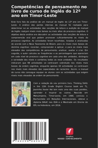 Este livro fala da análise de um manual de Inglês do 12º ano em Timor-Leste. A análise das partes internas do manual foi realizada para determinar se as actividades das secções de leitura e audição do manual de Inglês realçam níveis mais baixos ou mais altos do processo cognitivo. O objetivo desta análise era descobrir as actividades das secções de leitura e compreensão oral que podem promover suficientemente os níveis do processo cognitivo. As actividades foram recolhidas, listadas e analisadas de acordo com a Nova Taxonomia de Bloom, para os níveis mais baixos do domínio cognitivo: recordar, compreender e aplicar, e para os níveis mais elevados das competências de pensamento: analisar, avaliar e criar. Em seguida, o autor calculou as frequências e as percentagens que apareciam em cada nível do processo cognitivo em cada uma das unidades, distinguiu a variedade dos níveis e combinou todas as nove unidades. Os resultados indicaram que 98 actividades se centravam sobretudo nos níveis mais baixos da ordem cognitiva, enquanto apenas 63 actividades se centravam nos níveis mais elevados das capacidades de raciocínio. Assim, o manual do curso não consegue equipar os alunos com as actividades que exigem níveis mais elevados de ordem de pensamento.