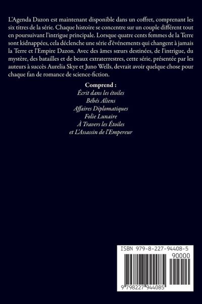 L'Agenda Dazon est maintenant disponible dans un coffret, comprenant les six titres de la série. Chaque histoire se concentre sur un couple différent tout en poursuivant l'intrigue principale. Lorsque quatre cents femmes de la Terre sont kidnappées, cela déclenche une série d'événements qui changent à jamais la Terre et l'Empire Dazon. Avec des âmes s¿urs destinées, de l'intrigue, du mystère, des batailles et de beaux extraterrestres, cette série, présentée par les auteurs à succès Aurelia Skye et Juno Wells, devrait avoir quelque chose pour chaque fan de romance de science-fiction. Comprend : Écrit dans les étoiles, Bébés Aliens, Affaires Diplomatiques, Folie Lunaire, À Travers les Étoiles, et L'Assassin de l'Empereur.