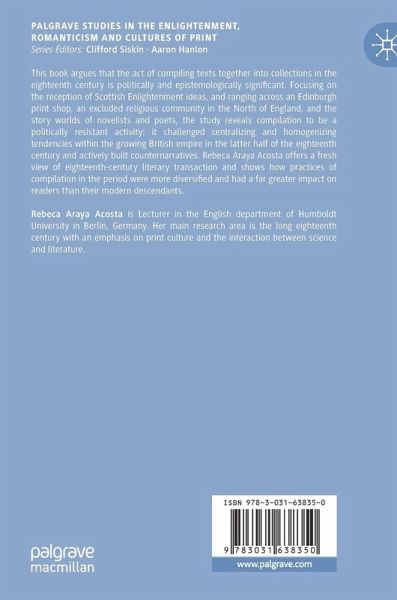 This book argues that the act of compiling texts together into collections in the eighteenth century is politically and epistemologically significant. Focusing on the reception of Scottish Enlightenment ideas, and ranging across an Edinburgh print shop, an excluded religious community in the North of England, and the story worlds of novelists and poets, the study reveals compilation to be a politically resistant activity: it challenged centralizing and homogenizing tendencies within the growing British empire in the latter half of the eighteenth century and actively built counternarratives. Rebeca Araya Acosta offers a fresh view of eighteenth-century literary transaction and shows how practices of compilation in the period were more diversified and had a far greater impact on readers than their modern descendants.