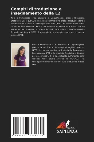 Nata a Pentecoste - CE. Laureata in Lingue/Inglese presso l'Università Statale del Ceará (UECE) e Tecnologa dell'Ospitalità presso l'Istituto Federale di Educazione, Scienza e Tecnologia del Ceará (IFCE). Ha ottenuto una borsa di studio internazionale IFCE e ha studiato ospitalità in Canada per un semestre. Ha conseguito un master in studi di traduzione presso l'Università Federale del Ceará (UFC). Attualmente è insegnante supplente di inglese presso l'IFCE.