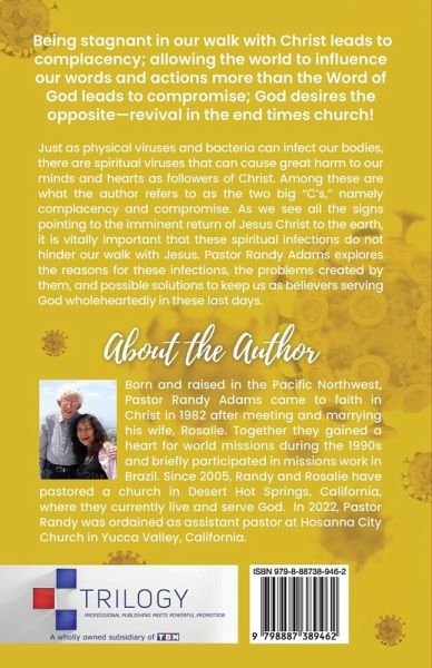 Being stagnant in our walk with Christ leads to complacency; allowing the world to influence our words and actions more than the Word of god leads to compromise; God desires the opposite -- revival in the end times church! Just as physical viruses and bacteria can infect our bodies, there are spiritual viruses that can cause great harm to our minds and hearts as followers of Christ. Among these are what the author refers to as the two big "C's," namely complacency and compromise. As we see all the signs pointing to the imminent return of Jesus Christ to the earth, it is vitally important that these spiritual infections do not hinder our walk with Jesus. Pastor Randy Adams explores the reasons for these infections, the problems created by them, and possible solutions to keep us as believers serving God wholeheartedly in these last days.