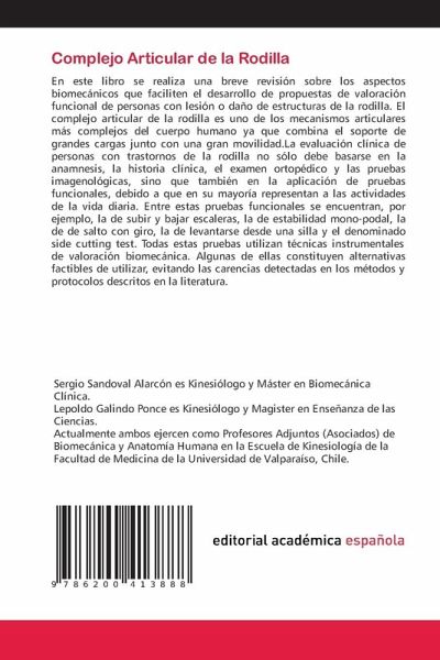 En este libro se realiza una breve revisión sobre los aspectos biomecánicos que faciliten el desarrollo de propuestas de valoración funcional de personas con lesión o daño de estructuras de la rodilla. El complejo articular de la rodilla es uno de los mecanismos articulares más complejos del cuerpo humano ya que combina el soporte de grandes cargas junto con una gran movilidad.La evaluación clínica de personas con trastornos de la rodilla no sólo debe basarse en la anamnesis, la historia clínica, el examen ortopédico y las pruebas imagenológicas, sino que también en la aplicación de pruebas funcionales, debido a que en su mayoría representan a las actividades de la vida diaria. Entre estas pruebas funcionales se encuentran, por ejemplo, la de subir y bajar escaleras, la de estabilidad mono-podal, la de de salto con giro, la de levantarse desde una silla y el denominado side cutting test. Todas estas pruebas utilizan técnicas instrumentales de valoración biomecánica. Algunas de ellas constituyen alternativas factibles de utilizar, evitando las carencias detectadas en los métodos y protocolos descritos en la literatura.