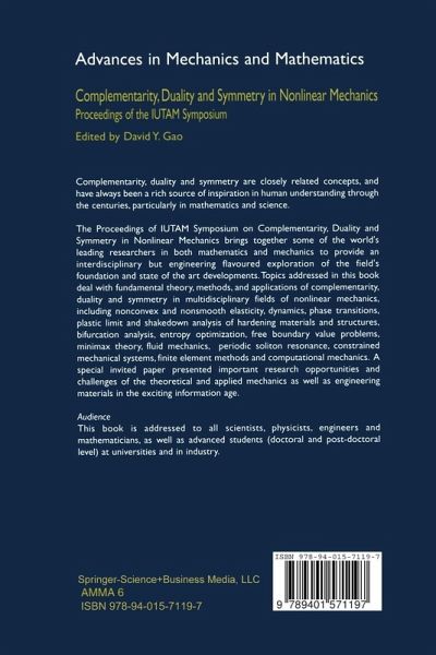 The Proceedings of IUTAM Symposium on Complementarity, Duality, and Symmetry in Nonlinear Mechanics brings together some of world's leading researchers in both mathematics and mechanics to provide an interdisciplinary but engineering flavoured exploration of the field's foundation and state of the art developments. Topics addressed in this book deal with fundamental theory, methods, and applications of complementarity, duality and symmetry in multidisciplinary fields of nonlinear mechanics, including nonconvex and nonsmooth elasticity, dynamics, phase transitions, plastic limit and shakedown analysis of hardening materials and structures, bifurcation analysis, entropy optimization, free boundary value problems, minimax theory, fluid mechanics, periodic soliton resonance, constrained mechanical systems, finite element methods and computational mechanics. A special invited paper presented important research opportunities and challenges of the theoretical and applied mechanics as well as engineering materials in the exciting information age.