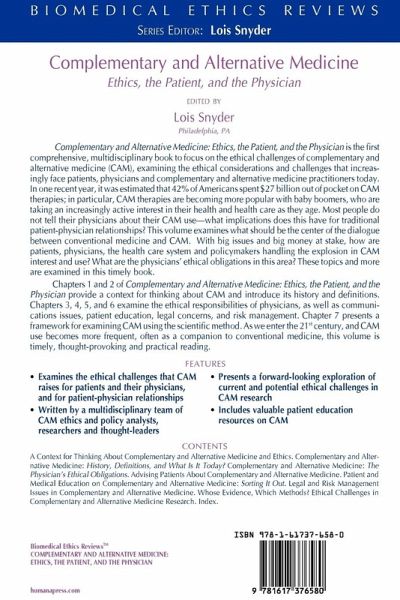 Because complementary and alternative medicine (CAM) are not presently considered to be a part of conventional medicine, this book discusses the effect that CAM has on patients, physicians, healthcare, and policymakers. Also included are the implications that CAM has on traditional patient-physician relationships as well as the physician's ethical obligations on this subject.