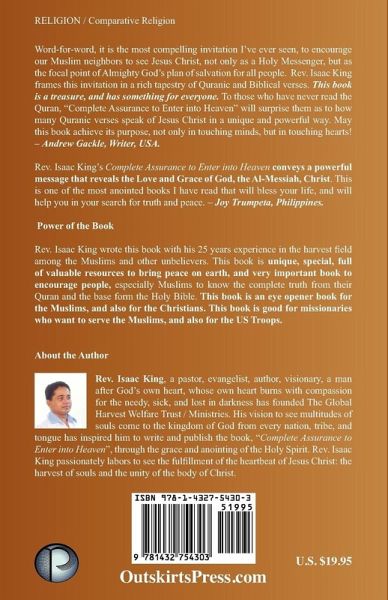 About the book Rev. Isaac King wrote the book titled, "Complete Assurance to Enter into Heaven" with his 25 years experience in the harvest field among the Muslims and other unbelievers. This book is unique, special, full of valuable resources to bring peace on earth, and very important book to encourage people, especially Muslims to know the complete truth from their Quran and the base form the Holy Bible. This book is an eye opener book for the Muslims, and also for the Christians. In 2005, he published this book in Bangladesh in Bangla language, and many educated Muslims like doctor, engineer, social and political leader already received the complete truth of salvation. They all have their personal testimony how they saved by reading this book. Even some of the fundamental political party's important men received salvation after reading this book. - Rev. Isaac King. What others said about this book: Word-for-word, it is the most compelling invitation I've ever seen, to encourage our Muslim neighbors to see Jesus Christ, not only as a Holy Messenger, but as the focal point of Almighty God's plan of salvation for all people. Rev. Isaac King frames this invitation in a rich tapestry of Quranic and Biblical verses. This book is a treasure, and has something for everyone. To those who have never read the Quran, "Complete Assurance to Enter into Heaven" will surprise them as to how many Quranic verses speak of Jesus Christ in a unique and powerful way. May this book achieve its purpose, not only in touching minds, but in touching hearts! - Andrew Gackle, Writer, USA. Rev. Isaac King's Complete Assurance to Enter into Heaven conveys a powerful message that reveals the Love and Grace of God, the Al-Messiah, Christ. This is one of the most anointed books I have read that will bless your life, and will help you in your search for truth and peace. - Joy Trumpeta, Philippines. Power of the Book The anointing in this book will bring you into the Kingdom of God, heaven. It can give you a life-changing experience and will encourage you to share it to others to bring them into the Kingdom of God. A person from any religion will understand how s/he can receive the true peace through the holiness of God, and how s/he can receive the Complete Assurance to Enter into Heaven by reading this book. This book is recommended for every person to read at least once in his/her lifetime to know the purpose of his/her life from the Creator, the One True Living God, the Almighty, and the King of Peace. About the Author REV. Isaac King, a pastor, evangelist, author, visionary, a man after God's own heart, whose own heart burns with compassion for the needy, sick, and lost in darkness has founded The Global Harvest Welfare Trust / Ministries. His vision to see multitudes of souls come to the kingdom of God from every nation, tribe, and tongue has inspired him to write and publish the book, "Complete Assurance to Enter into Heaven", through the grace and anointing of the Holy Spirit. Rev. Isaac King passionately labors to see the fulfillment of the heartbeat of Jesus Christ: the harvest of souls and the unity of the body of Christ. Finally, we assure you that your money and time investment to buy and study this book, definitely will give you satisfaction with hundred folds return in many ways. I hope you do not only read this book but also carefully study to receive the abundant blessings. So we encourage you to buy this book, so you may not miss the blessings of your life. Just know "Half Truth" is a lie, so knowing the complete truth is a great blessing. If you have any question please feel free to ask the author at: isaacking100@yahoo.com