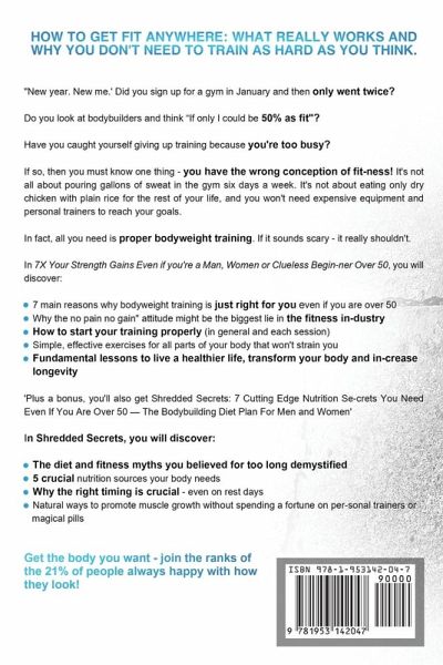 How to get fit anywhere: what really works and why you don't need to train as hard as you think. "New year. New me." Did you sign up for a gym in January and then only went twice? Do you look at bodybuilders and think "If only I could be 50% as fit"? Have you caught yourself giving up training because you're too busy? If so, then you must know one thing - you have the wrong conception of fitness! It's not all about pouring gallons of sweat in the gym six days a week. It's not about eating only dry chicken with plain rice for the rest of your life, and you won't need expensive equipment and personal trainers to reach your goals. In fact, all you need is proper bodyweight training. If it sounds scary - it really shouldn't. Most people start their training not knowing their limits, following general routines and making little to no changes in their lives. For some - the lucky few - it might work. But most of us need something more flexible, less straining and... much more effective. In 7X Your Strength Gains Even if you're a Man, Women or Clueless Beginner Over 50, you will discover: 7 main reasons why bodyweight training is just right for youeven if you are over 50 Why the "no pain no gain" attitude might be the biggest lie in the fitness industry The most common mistakesin strength training and how to avoid them What 2 things get the most overlooked in training - and how crucial they are How to start your training properly(in general and each session) Simple, effective exercises for all parts of your body that won't strain you The scientific secret of strength and muscle growth How much should a 50-year-old exercise? Fundamental lessons to live a healthier life, transform your body and increase longevity How to become the master of your own training routine And much more. Starting a workout routine always seems scary - especially if you're a novice. You immediately think of all the restrictions, equipment, pain... But it's time to wave those fears goodbye. With bodyweight training, you can train in your living room for free, with no equipment other than your body. Whenever you want, how much you want. With the flexible, attainable workout routine you will discover in this book, the path to fitness will seem like a walk in the park. If you think you are too out-of-shape, or sick, or tired, or just plain old to exercise - you are wrong. *Plus a bonus, you'll also get Shredded Secrets: 7 Cutting Edge Nutrition Secrets You Need Even If You Are Over 50 - The Bodybuilding Diet Plan For Men and Women* In Shredded Secrets, you will discover: The diet and fitness myths you believed for too long demystified 5 crucialnutrition sources your body needs Why the right timing is crucial- even on rest days Natural ways to promote muscle growth without spending a fortune on personal trainers or magical pills How knowing simple science can aid in your quest for fitness Get the body you want - join the ranks of the 21% of people always happy with how they look! Just click "Add to cart" and enjoy your smooth way to fitness.