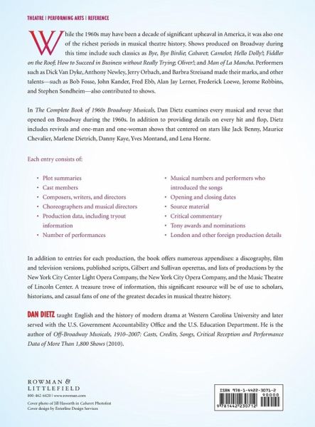 The book examines in specific detail every Broadway musical that opened during the seminal decade of the 1960s, a decade which encompassed traditional musicals (such as Hello, Dolly!) as well as iconoclastic ones (Cabaret, Hair). Besides technical information, the book includes extensive commentary for all 268 musicals which opened during the decade. It includes all New York City Center and Music Theatre of Lincoln Center revivals; New York City Opera revivals of Broadway musicals; productions of all pre-Broadway closings (musicals which closed either during New York previews or during pre-Broadway tryouts); all eight musicals which were produced at the 1964 New York World's Fair; concert productions (usually of one-man or one-woman shows); and all imports which opened during the decade. The technical information includes details regarding cast and credits, plot, critical reviews, London productions, recordings, published scripts, and film versions.