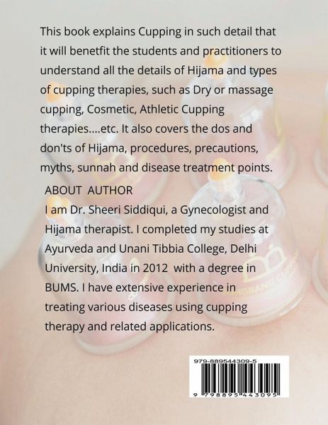 This book explains cupping in such detail that it will benefit students and practitioners to understand all the details of Hijama and the types of cupping therapies, such as dry or massage cupping, cosmetic cupping, and athletic cupping therapies. It also covers the dos and don'ts of Hijama, procedures, precautions, myths, Sunnah, and disease treatment points.
