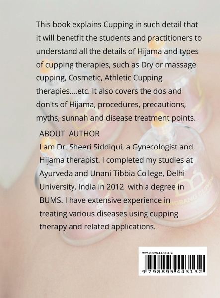 This book explains cupping in such detail that it will benefit students and practitioners to understand all the details of Hijama and the types of cupping therapies, such as dry or massage cupping, cosmetic cupping, and athletic cupping therapies. It also covers the dos and don'ts of Hijama, procedures, precautions, myths, Sunnah, and disease treatment points.