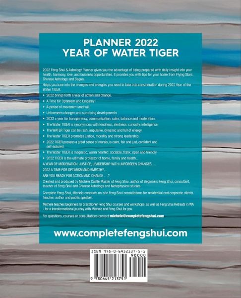 The 2022 Complete Feng Shui Planner: Year of Water Tiger 2022 Feng Shui & Astrology planner will provide you with the utmost insights into your business, finances, love, health, and emotions. With everything from Flying Starts to Chinese Astrology, this book will surely provide you with all the tips you'll need for the year! No matter your age, Self-Element, or Animal Sign, this guide will give allow you to take a deep dive into how to make 2022 the best year yet!