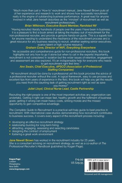 Recruiting the right people is one of the most important activities organisations can undertake. Getting it right can mean fast, healthy growth and the fulfilment of business goals; getting it wrong can mean heavy costs, sinking morale and stunted growth. The Complete Guide to Recruitment is a practical self-help guide to best practice in recruitment. With international case studies demonstrating how recruitment contributes to business success, it covers every aspect of the recruitment process including: developing an effective recruitment strategy; relationship building for long-term hiring; assessing and selecting candidates; designing the contract of employment; and creating a great place to work. Also incorporating a broad range of sample adverts, contracts and assessment tests which are available to download and edit, The Complete Guide to Recruitment is ideal for companies of all types and sizes who want to attract and retain top talent.