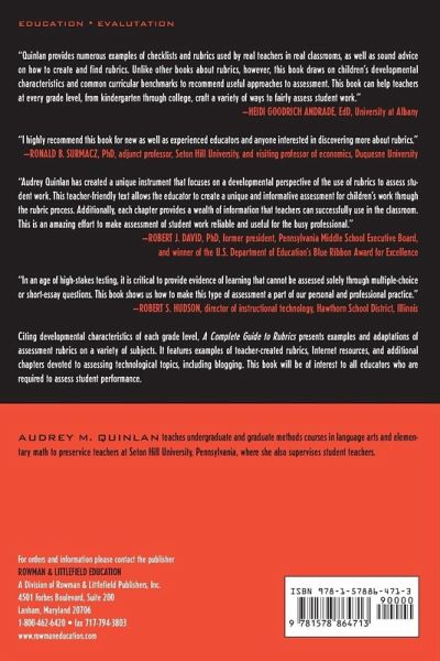 Audrey Quinlan has created a unique instrument that focuses on a developmental perspective of the use of rubrics to assess student work. This teacher-friendly text allows the educator to create a unique and informative assessment for children's work through the rubric process. Additionally, each chapter provides a wealth of information that teachers can successfully use in the classroom. This is an amazing effort to make assessment of student work reliable and useful for the busy professional. -- Robert J. David, Ph.D., former president, Pennsylvania Middle School (PMSA) Executive Board, and winner of the U. S. Department of Education?s Blue Ribb I highly recommend this book for new as well as experienced educators and anyone interested in discovering more about rubrics. -- Ronald B. Surmacz, Ph.D., adjunct professor, Seton Hill University, and visiting professor of economics, Duquesne University Quinlan provides numerous examples of checklists and rubrics used by real teachers in real classrooms, as well as sound advice on how to create and find rubrics. Unlike other books about rubrics, however, this book draws on children's developmental characteristics and common curricular benchmarks to recommend useful approaches to assessment. This book can help teachers at every grade level, from kindergarten through college, craft a variety of ways to fairly assess student work. -- Heidi Goodrich Andrade, Ed.D., assistant professor, Division of Educational Psychology and Methodology, University at Albany A Complete Guide to Rubrics is a practical approach for students, teachers, administrators, and parents to begin the process of incorporating meaningful techniques for assessing student learning processes and products. Examples and explanations of developmental levels make this a valuable resource for all grade levels. Moreover, attention to products and projects created for online activity, software assessment, and web page evaluation contribute to the timeliness of the approaches contained in this work. A Complete Guide to Rubrics provides a framework for communicating expectations of learning outcomes and their alignment with established goals or standards with all stakeholders. Additional resources are provided through web sites and resources listed at the end of each chapter. In an age of high-stakes testing, it is critical to provide evidence of learning that cannot be assessed solely through multiple choice or short essay questions. This book shows us how to make this type of assessment a part of our personal and professional practice. -- Robert S. Hudson, director of instructional technology, Hawthorn School District, Illinois