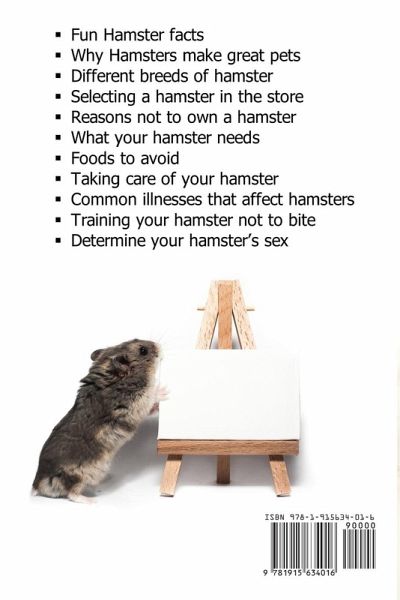 Full color comprehensive hamster care manual for all popular breeds. Covering:Fun hamster facts Why hamsters make great pets Different breeds of hamster Selecting a hamster in the store Reasons not to own a hamster What your hamster needs Foods to avoid Taking care of your hamster Common illnesses that affect hamsters Training your hamster not to bite Determine your hamster's sex