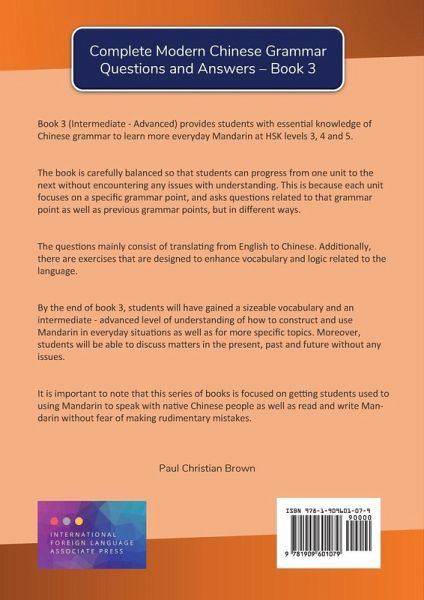 Book 3 (Intermediate - Advanced) provides students with essential knowledge of Chinese grammar to learn more everyday Mandarin at HSK levels 3, 4 and 5. The book is carefully balanced so that students can progress from one unit to the next without encountering any issues with understanding. This is because each unit focuses on a specific grammar point, and asks questions related to that grammar point as well as previous grammar points, but in different ways. The questions mainly consist of translating from English to Chinese. Additionally, there are exercises that are designed to enhance vocabulary and logic related to the language. By the end of book 3, students will have gained a sizeable vocabulary and an intermediate - advanced level of understanding of how to construct and use Mandarin in everyday situations as well as for more specific topics. Moreover, students will be able to discuss matters in the present, past and future without any issues. It is important to note that this series of books is focused on getting students used to using Mandarin to speak with native Chinese people as well as read and write Mandarin without fear of making rudimentary mistakes.