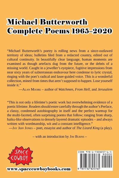 Across Michael Butterworth's work, elements are reiterated but endlessly transfigured - hitchhiking girlfriends, elm trees, the moon, astronauts, the space race, collage artists, misophonia, marriage, divorce, beached whales, clifftops, the sea, the seasons, mental block, ale houses, the chemical laboratory, ambition, madness, pain, death and impermanence, silver birch trees, suicide, Zazen, riots, train seating indicators, camping, the Welfare State, crows and seagulls, the racist English and Canada geese... are some of his subjects. The subjects of destruction - war, the consumer society, 'progress', humanity's inhumanity, the doings of men (and the necessity of a new woman), galactic war, drug wars, hunting - are never far away, hopefully countered by the tone of optimism found in his later poems inspired by Buddhist philosophy. The effect is at once familiar and yet profound, in language that has the confessional qualities and simplicity of early influences such as Sylvia Plath and the Beats, and the later influence of Zen poets such as Ry¿kan. Occasionally the writing is startlingly radical - a reminder of the poet's beginnings in the New Wave. A collection such as this one from Space Cowboy Books is overdue, and Complete Poems: 1965-2020 brings to more deserving attention a less heard voice in modern poetry.