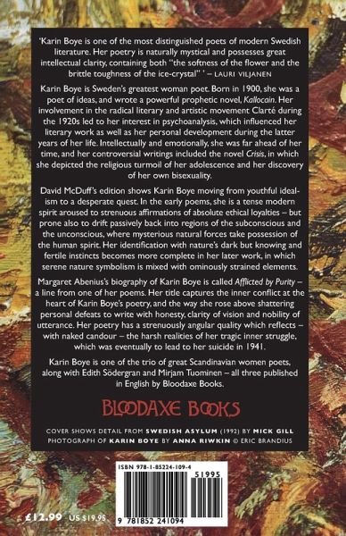 Karin Boye is Sweden's greatest woman poet. Born in 1900, she was a poet of ideas, and wrote a powerful prophetic novel, Kallocain. Her involvement in the radical literary and artistic movement Clarté during the 1920s led to her interest in psychoanalysis, which influenced her literary work as well as her personal development during the latter years of her life. Intellectually and emotionally, she was far ahead of her time, and her controversial writings included the novel Crisis, in which she depicted the religious turmoil of her adolescence and her discovery of her own bisexuality. David McDuff's edition shows Karin Boye moving from youthful idealism to a desperate quest. In the early poems, she is a tense modern spirit aroused to strenuous affirmations of absolute ethical loyalties - but prone also to drift passively back into regions of the subconscious and the unconscious, where mysterious natural forces take possession of the human spirit. Her identification with nature's dark but knowing and fertile instincts becomes more complete in her later work, in which serene nature symbolism is mixed with ominously strained elements. Margaret Abenius's biography of Karin Boye is called Afflicted by Purity - a line from one of her poems. Her title captures the inner con¿ict at the heart of Karin Boye's poetry, and the way she rose above shattering personal defeats to write with honesty, clarity of vision and nobility of utterance. Her poetry has a strenuously angular quality which re¿ects - with naked candour - the harsh realities of her tragic inner struggle, which was eventually to lead to her suicide in 1941. Karin Boye is one of the trio of great Scandinavian women poets, along with Edith Södergran and Mirjam Tuominen - all three published in English by Bloodaxe Books.