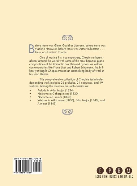 Before there was Glenn Gould or Liberace, before there was Vladimir Horowitz, before there was Arthur Rubinstein . . . there was Frederic Chopin. One of music’s first true superstars, Chopin set hearts aflutter around the world with some of the most beautiful piano compositions of the Romantic Era. Beloved by fans as well as contemporaries like Franz Liszt and Robert Schumann, the brilliant yet fragile Chopin created an astonishing body of work in his short lifetime. This comprehensive collection of Chopin’s technically demanding work includes 26 preludes, 21 nocturnes, and 19 waltezes. Among the favorites are such classics as: Prelude in A-flat Major (1834) Nocturne in C-sharp minor (1830) Nocturne in C minor (1837) Waltzes in A-flat major (1830), E-flat Major (1840), and A minor (1843)