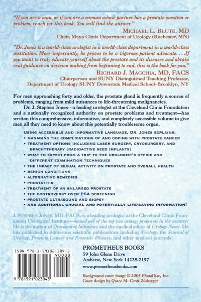 ""[U]rologist Jones (Cleveland Clinic Fdn. Urological Inst.) thoroughly and clearly demystifies prostate anatomy and function as well as abnormalities ranging from common annoyances to the most devastating cancerous conditions. In addition, he details the full array of treatments for prostate disorders. The book's goal is well met - to help men make (with their physician) informed prostate health and medical decisions based on their individual risk factors and current medical knowledge. A glossary, notes, and a resource section nicely round out the text." -Library Journal ...a thorough-going guide to a medical condition that any man approaching forty or older can encounter. The prostrate gland is frequently a source of health problems ranging from mild nuisances to life-threatening malignancies. This softcover book provides a complete review and explanation of what the various medical conditions involving this gland represent and the options available to address them." - Bookviews.com "Dr. J. Stephen Jones has provided a compendium of information regarding prostate health and disease that is both easy to read and understandable. If you are a man, or if you are a woman whose partner has a prostate question or problem, reach for this book. You will find the answer." Michael L. Blute, M.D. Chair, Mayo Clinic Department of Urology "Dr. Jones is a world-class urologist in a world-class department in a world-class institution. More importantly, he proves to be a vigorous patient advocate.... If you want to truly educate yourself about the prostate and its diseases and obtain real guidance on decision making from beginning to end, this is the book for you." Richard J. Macchia, MD, FACS Chairperson and SUNY Distinguished Teaching Professor Department of Urology, SUNY Downstate Medical Schoo
