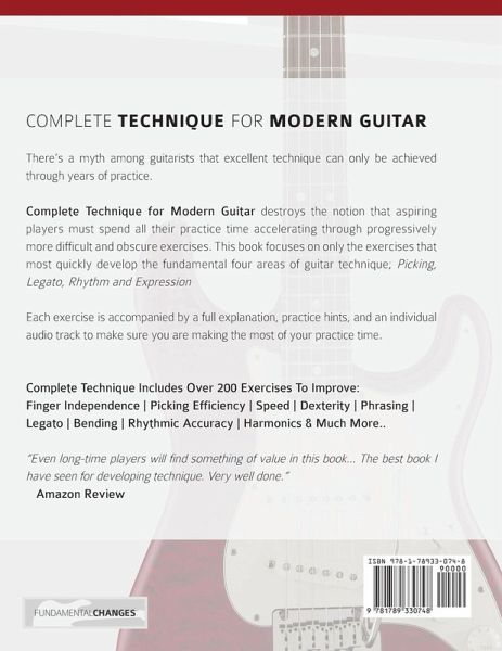 Complete Technique for Modern Guitar destroys the notion that aspiring players must spend all their practice time accelerating through progressively more difficult and obscure exercises. This book focuses on only the exercises that most quickly develop the fundamental four areas of guitar technique: Picking, Legato, Playing in time, and expression.