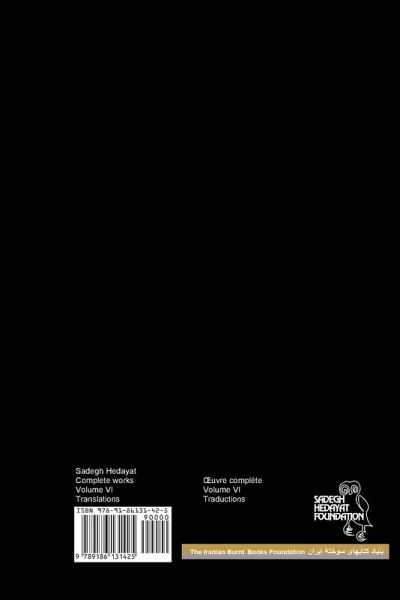 Published in Farsi language by the "Sadegh Hedayat Foundation" and the renowned "Iranian Burnt Books Foundation", this is the sixth volume of the revised and according to original manuscripts comparatively updated complete works of Sadegh Hedayat, the renowned Iranian novelist. This volume contains his translations of works from other writers from French into Farsi. Sadegh Hedayat was born on 17 February 1903 in Tehran, at his father's house. His father was Hedayat Gholi Khan-e Hedayat (E'tezad-Ol-Molk),son of Jafar GholiKhan-e Hedayat,his mother was ,Ozra-Zivar-Ol-Moluk Hedayat,daughter of Hossein GholiKhan-e Mokhber-ol-Dole the second. His parent was from the line of Reza GholiKhan; who was one of the famous Iranian writers, poets and historians in 13th century; that was Kamal Khojandi descents. He went to Elmieh Primary school, Tehran in 1909, and after completing his basic education and then started his high school at Darolfonun in 1914. Because of eye trouble, there was a break in his education in 1914, but he continued his education in Saint Louis School at Tehran, where he got familiar with French language and literature in 1917. He completed his secondary education and was sent with the other Iranian students to Belgium for higher education in 1925. At first, he studied in "Gand" Port University, but he declared his dissatisfaction, because of bad weather and his education situation, so he was transferred to Paris to continue his studies. In1928, Sadegh Hedayat, attempted to his first suicide by throwing himself into Marne River in Samoi, but he was rescued by the people in a boat. Finally, in 1930, he returned back to Tehran and in that year he was hired in Bank Melli Iran. In those days "Rabe Group" was formed including Bozorg Alavi, Massud Farzad, Mojtaba Minavi and Sadegh Hedayat.In 1932, he traveled to Isfahan and also started his work at General Department of Commerce. In 1933, he traveled to Shiraz and stayed in his uncle's house (Dr.Kraim Hedayat) for awhile. In 1934, he resigned from General Department of Commerce and commenced his work at Ministry Of Foreign Affairs; he resigned from Ministry Of Foreign Affairs in 1935, and in that year he was summoned by Police Investigation Department and interrogated for the context of the book "Mister Bow Wow". In 1936,he commenced working at General Department of Construction and traveled to India ,he started learning "Pahlavi Language" with an Indian researcher and professor; Bahram Goor Anklesaria. In 1937, he returned back to Tehran, started working in Bank Melli Iran again, he resigned from there again in 1938, and started working at State Music Department and also cooperating with "Music Magazine". In 1940 he commenced his work at Fine Art Faculty of Tehran University as translator, and cooperating with "Sokhan Magazine" in 1943.He went to Tashkent by the invitation of The State University of Middle Asia in Uzbekistan in 1945, and also cooperated with "Payam e Now Magazine". In that year a ceremony for honoring Sadegh Hedayat was held in Iran and Soviet Union Cultural Society, in 1949.He was invited to participate in The World Congress of Peace but he could not attend because of his administrative problems. In 1950, he went to Paris and on April 8 1951, in that city, he committed suicide by gaz.He was 48 years old when got himself free from life pains, his grave was in Pere-la Chaise Cemetery in Paris. He spent all his life in his father's house.