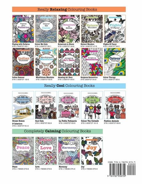 Completely Calming Colouring Book 4: JOY is a beautiful and relaxing creative colouring book for all ages ! Switch off, unwind, and find some peace and joy in your day as you unleash your inner creativity and lose yourself in the flow of colouring in these stunning patterns and designs. Each of these beautiful individual designs are printed on a single page with the reverse left blank - so no bleed through, and perfect whether you use pencils, pens or paints. Collect the whole ' Really Relaxing Colouring Book' series, or try our unique ' Cool Colouring Books' Collection too!