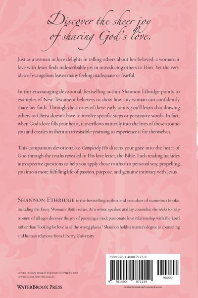 Discover the sheer joy of sharing God's love. Just as a woman in love delights in telling others about her beloved, a woman in love with Jesus finds indescribable joy in introducing others to Him. Yet the very idea of evangelism leaves many feeling inadequate or fearful. In this encouraging devotional, best-selling author Shannon Ethridge points to examples of New Testament believers to show how any woman can confidently share her faith. Through the stories of these early saints, you'll learn that drawing others to Christ doesn't have to involve specific steps or persuasive words. In fact, when God's love fills your heart, it overflows naturally into the lives of those around you and creates in them an irresistible yearning to experience it for themselves. This companion devotional to Completely His directs your gaze into the heart of God through the truths revealed in His love letter, the Bible. Each reading includes introspective questions to help you apply those truths in a personal way, propelling you into a more fulfilling life of passion, purpose, and genuine intimacy with Jesus.