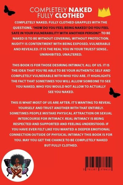 Completely Naked, Fully Clothed grapples with the questions, "How do you feel being naked? Do you feel safe in your vulnerability with another person?" To be naked is to be without covering, without protection. Nudity is contentment with being exposed, vulnerable and revealed. It is the real you in your truest sense.. uninhibited, unaltered. This book is for those desiring intimacy, all of us. It is the idea that you're able to be your authentic self and completely vulnerable with who you are. It highlights the fact that sometimes you will allow someone to see you naked, who you would not allow to actually SEE YOU naked. This is what most of us are after. It's wanting to reveal yourself and trust another with that entirely. Sometimes people mistake physical attraction or sexual intercourse for intimacy. Real intimacy is being respected and supported and feeling understood. If you have ever felt like you wanted a deeper emotional connection outside of physical intimacy this book is for you. May you get the chance to be completely naked but fully clothed.