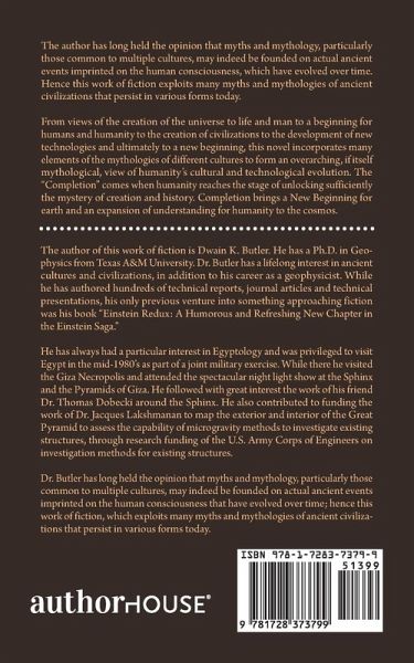 The author has long held the opinion that myths and mythology, particularly those common to multiple cultures, may indeed be founded on actual ancient events imprinted on the human consciousness, which have evolved over time. Hence this work of fiction exploits many myths and mythologies of ancient civilizations that persist in various forms today. From views of the creation of the universe to life and man to a beginning for humans and humanity to the creation of civilizations to the development of new technologies and ultimately to a new beginning, this novel incorporates many elements of the mythologies of different cultures to form an overarching, if itself mythological, view of humanity's cultural and technological evolution. The "Completion" comes when humanity reaches the stage of unlocking sufficiently the mystery of creation and history. Completion brings a New Beginning for earth and an expansion of understanding for humanity to the cosmos.
