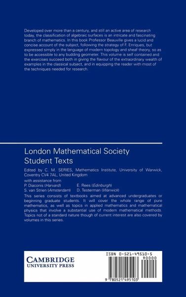 A lucid and concise account of the classification of algebraic surfaces, but expressed simply in the language of modern topology and sheaf theory. The ample number of exercises succeed both in giving the flavour of the extraordinary wealth of examples in the classical subject, and in equipping the reader with most of the techniques needed for research.