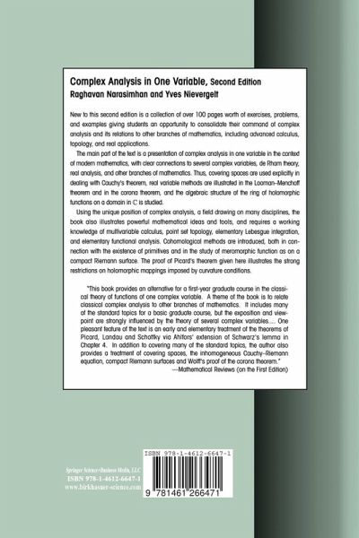 "The first part of the book under review represents essentially the material of R. Narasimhan's 'Complex analysis in one variable' (first edition, 1985). The second part of the book, authored by Y. Nievergelt, consists of exercises and relevant references.... There are notes at the end of each chapter which contain brief remarks on the history of the material presented as well as references to the literature. The exercises of part II give the reader the opportunity to consolidate his knowledge in complex analysis. At the end of this part there are notes for the exercises and references. The book can be highly recommended for a thorough study of complex analysis." -ZENTRALBLATT MATH (Review of the second edition) "The book introduces and makes use of concepts from many different areas of mathematics, especially ideas used in several complex variables and differential geometry. There is also a short...introductory chapter dealing with several complex variables.... The exercises in Part 2 vary from basic to advanced, and provide good practice for the concepts and techniques of the subject.... The choice of topics covered gives an excellent introduction to modern complex analysis. The exposition is well written. All in all, this book is a welcome addition to the list of books presenting a first course in complex analysis." -MATHEMATICAL REVIEWS (Review of the second edition) "Provides a smooth and unintimidating transition from classical complex analysis in the plane to modern abstract theory on manifolds... An excellent, carefully written and thematically rich book which does not overwhelm the reader... Well-suited as a textbook either for sophisticated beginners or as a sequel to a one-semester introductory course." -JAHRESBERICHT DER DMV (Review of the first edition)