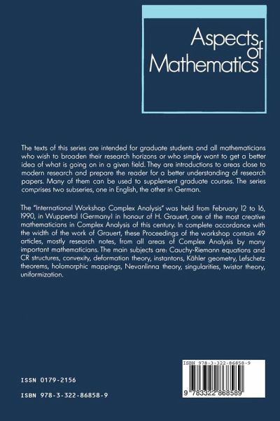 Smooth Proper Modifications of Compact Kähler Manifolds.- Lp-Estimates for ?? in C.- Canonical Resolutions in Sheaves on Schubert and Brieskorn Varieties.- La forme hermitienne canonique pour une singularité presque isolée.- A Generalized Cousin Problem for Subvarieties of the Bidisk.- Scalar Curvature and Twistor Geometry.- Some Remarks on Weighted Estimates for ??.- Circular Models and Normal Forms for Convex Domains.- Lp-Estimates with Loss for the Bergman-Projection and the Canonical Solution to ??.- Distortion Function and the Heat Kernel of a Positive Line Bundle.- Twistor Spaces and Non-hyperbolicity of Certain Symplectic Kähler Manifolds.- Envelopes of Holomorphy of Domains in Cn.- Representing Measures in the Spectrum of H? (?).- Estimées Ck, ? pour l'equation ?? = f dans les convexes.- Local Hyperconvexity and Local Hyperconcavity.- Domaines à estimation maximale.- Deformation of Compact Rieman Surfaces with Distinguished Points.- Local Extension of Holomorphic L2-Functions with Weights.- On the Boundary Behavior of the Caratheodory and Kobayashi Distances in Strongly Pseudoconvex Domains in Cn.- Zur Klassifikation der 1-konvexen komplexen Räume.- Holomorphic Mappings into Convex Domains.- On Second Order Hypoelliptic Differential Operators and the ??-Neumann Problem.- Equisingularity of Analytically Constructible Sets.- Fonction de Artin d'un germe d'espace analytique.- Local Peaks Sets and Maximum Modulus Sets in Products of Strictly Pseudoconvex Domains.- Hyperbolic C* -Actions on Affine Surfaces.- On Complex Manifolds Exhausted by Biholomorphic Images of Generalized Complex Ellipsoids E(n; n1,@@@, ns; p1,@@@, ps).- The Hard Lefschetz Theorem for Concave and Convex Algebraic Manifolds.- Sur la résolution des équations deCauchy-Riemann tangentielles pour les formes à support compact dans les variétes.- Imbedding Pseudohermitian Manifolds into a Sphere.- Deformations of Strongly Pseudo-Convex CR Structures and Deformations of Normal Isolated Singularities.- The Behavior of Multiplier Ideal Sheaves under Morphisms.- Local Geometry of Decoupled Pseudoconvex Domains.- A Vanishing Theorem on Kähler Manifolds with Certain Stratified Structures.- Hodge-Kohomologie und Steinsche Mannigfaltigkeiten.- The Cauchy-Riemann Equations in Convex Domains.- Integral Kernels and Hölder Estimates for ?? on Pseudoconvex Domains of Finite Type on C2.- Complex Analysis in the Golden Fifties.- On q-Convex Exhaustion Functions of Complements of CR-Submanifolds.- A Characterization of Homogeneous Bounded Domains.- Singular Sets of Separately Analytic Functions.- Some Recent Results Related to the Uniformization Problem in Several Complex Variables.- Product Decomposition of Non-reduced Space Germs.- Modular Subgerms and the Isomorphism Problem in Deformation Theory.- A New Method to Introduce a-priori Estimates for the ??-Neumann Problem.- Maximal and Semi-Maximal Estimates for ??b on Pseudoconvex Manifolds.- Degenerations of Instantons.- Second Main Theorems in Number Theory and Nevanlinna Theory.- Symplectic Techniques in Holomorphic Group Actions.