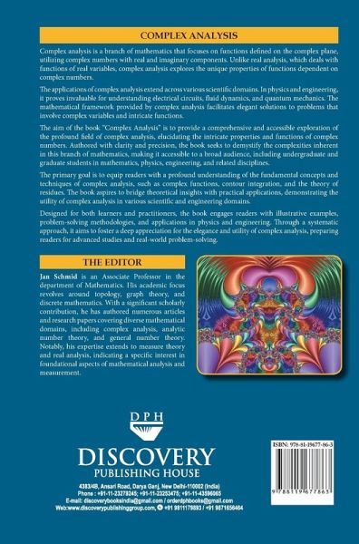 Complex analysis is a branch of mathematics that focuses on functions defined on the complex plane, utilizing complex numbers with real and imaginary components. Unlike real analysis, which deals with functions of real variables, complex analysis explores the unique properties of functions dependent on complex numbers.The aim of the book "Complex Analysis" is to provide a comprehensive and accessible exploration of the profound field of complex analysis, elucidating the intricate properties and functions of complex numbers. Authored with clarity and precision, the book seeks to demystify the complexities inherent in this branch of mathematics, making it accessible to a broad audience, including undergraduate and graduate students in mathematics, physics, engineering, and related disciplines.