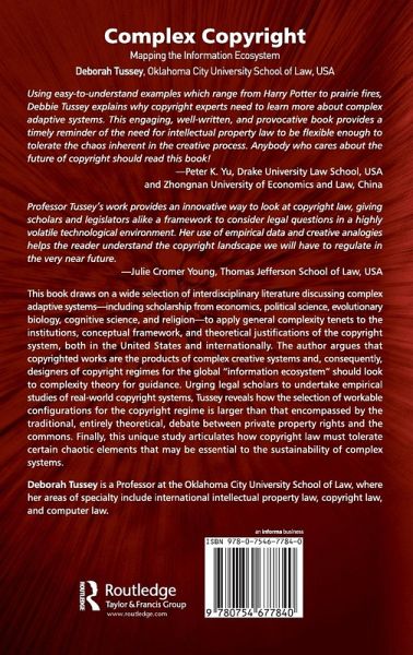 This book draws on a wide selection of interdisciplinary literature discussing complex adaptive systems - including scholarship from economics, political science, evolutionary biology, cognitive science, and religion - to apply general complexity tenets to the institutions, conceptual framework, and theoretical justifications of the copyright system, both in the United States and internationally. The author argues that copyrighted works are the products of complex creative systems and, consequently, designers of copyright regimes for the global 'information ecosystem' should look to complexity theory for guidance. Urging legal scholars to undertake empirical studies of real-world copyright systems, Tussey reveals how the selection of workable configurations for the copyright regime is larger than that encompassed by the traditional, entirely theoretical, debate between private property rights and the commons. Finally, this unique study articulates how copyright law must tolerate certain chaotic elements that may be essential to the sustainability of complex systems.