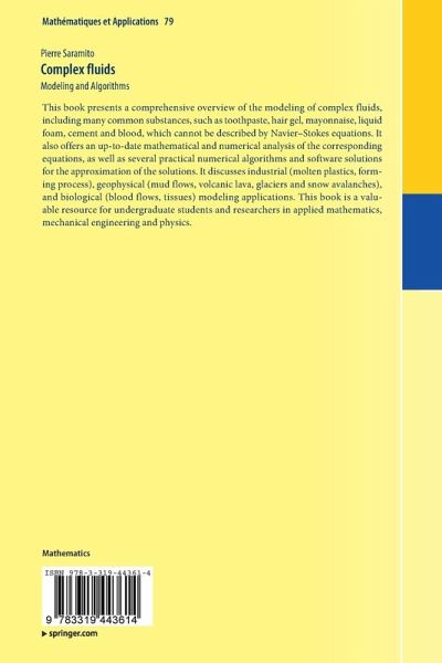 This book presents a comprehensive overview of the modeling of complex fluids, including many common substances, such as toothpaste, hair gel, mayonnaise, liquid foam, cement and blood, which cannot be described by Navier-Stokes equations. It also offers an up-to-date mathematical and numerical analysis of the corresponding equations, as well as several practical numerical algorithms and software solutions for the approximation of the solutions. It discusses industrial (molten plastics, forming process), geophysical (mud flows, volcanic lava, glaciers and snow avalanches), and biological (blood flows, tissues) modeling applications. This book is a valuable resource for undergraduate students and researchers in applied mathematics, mechanical engineering and physics.