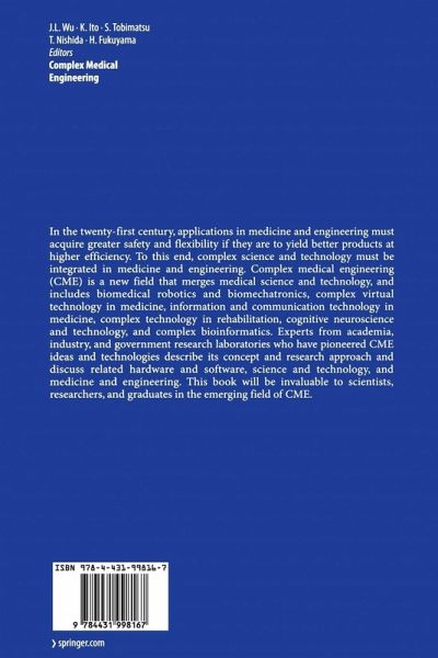 In the twenty-first century, applications in medicine and engineering must acquire greater safety and flexibility if they are to yield better products at higher efficiency. To this end, complex science and technology must be integrated in medicine and engineering. Complex medical engineering (CME) is a new field that merges medical science and technology, and includes biomedical robotics and biomechatronics, complex virtual technology in medicine, information and communication technology in medicine, complex technology in rehabilitation, cognitive neuroscience and technology, and complex bioinformatics. Experts from academia, industry, and government research laboratories who have pioneered CME ideas and technologies describe its concept and research approach and discuss related hardware and software, science and technology, and medicine and engineering. This book will be invaluable to scientists, researchers, and graduates in the emerging field of CME.