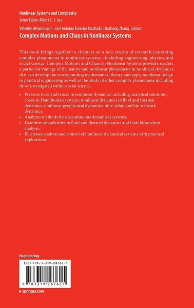 This book brings together 12 chapters on a new stream of research examining complex phenomena in nonlinear systems-including engineering, physics, and social science. Complex Motions and Chaos in Nonlinear Systems provides readers a particular vantage of the nature and nonlinear phenomena in nonlinear dynamics that can develop the corresponding mathematical theory and apply nonlinear design to practical engineering as well as the study of other complex phenomena including those investigated within social science.