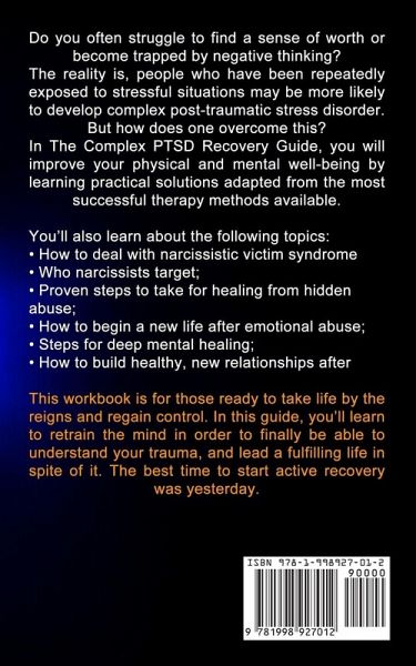 Do you often struggle to find a sense of worth or become trapped by negative thinking? The reality is, people who have been repeatedly exposed to stressful situations may be more likely to develop complex post-traumatic stress disorder. But how does one overcome this? In The Complex PTSD Recovery Guide, you will improve your physical and mental well-being by learning practical solutions adapted from the most successful therapy methods available. You'll also learn about the following topics:How to deal with narcissistic victim syndrome Who narcissists target; Proven steps to take for healing from hidden abuse; How to begin a new life after emotional abuse; Steps for deep mental healing; How to build healthy, new relationships after This workbook is for those ready to take life by the reigns and regain control. In this guide, you'll learn to retrain the mind in order to finally be able to understand your trauma, and lead a fulfilling life in spite of it. The best time to start active recovery was yesterday.