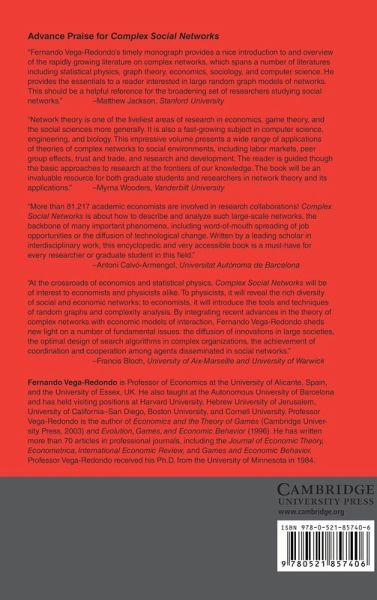 "At the crossroads of economics and statistical physics, Complex Social Networks will be of interest to economists and physicists alike. To physicists, it will reveal the rich diversity of social and economic networks; to economists, it will introduce the tools and techniques of random graphs and complexity analysis. By integrating recent advances in the theory of complex networks with economic models of interaction, Fernando Vega Redondo sheds new light onto a number of fundamental issues: the diffusion of innovations in large societies, the optimal design of search algorithms in complex organizations, the achievement of coordination and cooperation among agents disseminated in social networks." --Francis Bloch, University of Aix-Marseille and University of Warwick