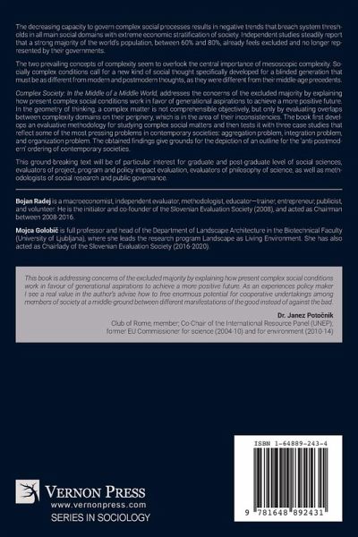 The decreasing capacity to govern complex social processes results in negative trends that breach system thresholds in all main social domains with extreme economic stratification of society. Independent studies steadily report that a strong majority of the world's population, between 60% and 80%, already feels excluded and no longer represented by their governments. The two prevailing concepts of complexity seem to overlook the central importance of mesoscopic complexity. Socially complex conditions call for a new kind of social thought specifically developed for a blinded generation that must be as different from modern and postmodern thoughts, as they were different from their middle-age precedents. 'Complex Society: In the Middle of a Middle World', addresses the concerns of the excluded majority by explaining how present complex social conditions work in favor of generational aspirations to achieve a more positive future. In the geometry of thinking, a complex matter is not comprehensible objectively, but only by evaluating overlaps between complexity domains on their periphery, which is in the area of their inconsistencies. The book first develops an evaluative methodology for studying complex social matters and then tests it with three case studies that reflect some of the most pressing problems in contemporary societies: aggregation problem, integration problem, and organization problem. The obtained findings give grounds for the depiction of an outline for the 'anti-postmodern' ordering of contemporary societies. This ground-breaking text will be of particular interest for graduate and post-graduate level of social sciences, evaluators of project, program and policy impact evaluation, evaluators of philosophy of science, as well as methodologists of social research and public governance.