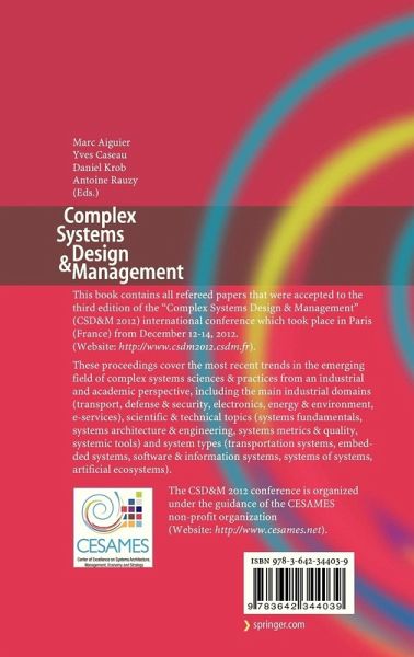 These proceedings cover the most recent trends in the emerging field of complex systems sciences & practices from an industrial and academic perspective, including the main industrial domains (transport, defense & security, electronics, energy & environment, e-services), scientific & technical topics (systems fundamentals, systems architecture& engineering, systems metrics & quality, systemic tools) and system types (transportation systems, embedded systems, software & information systems, systems of systems, artificial ecosystems).