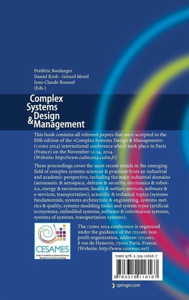 These proceedings cover the most recent trends in the emerging field of complex systems sciences & practices from an industrial and academic perspective, including the main industrial domains (aeronautic & aerospace, transportation & systems, defense & security, electronics & robotics, energy & environment, health & welfare services, software & e-services), scientific & technical topics (systems fundamentals, systems architecture & engineering, systems metrics & quality, systemic tools) and system types (transportation systems, embedded systems, software & information systems, systems of systems, artificial ecosystems).
