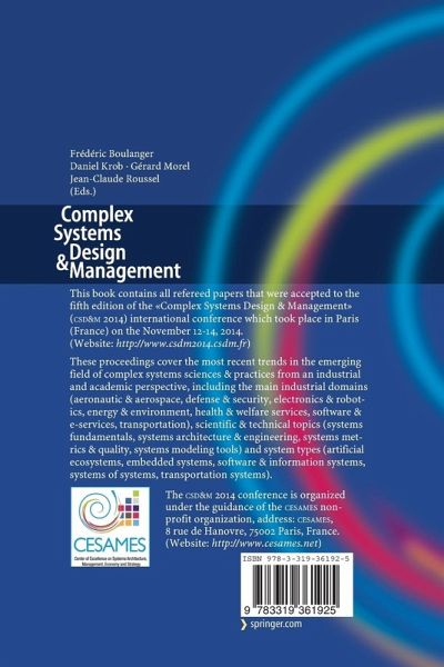 These proceedings cover the most recent trends in the emerging field of complex systems sciences & practices from an industrial and academic perspective, including the main industrial domains (aeronautic & aerospace, transportation & systems, defense & security, electronics & robotics, energy & environment, health & welfare services, software & e-services), scientific & technical topics (systems fundamentals, systems architecture & engineering, systems metrics & quality, systemic tools) and system types (transportation systems, embedded systems, software & information systems, systems of systems, artificial ecosystems).