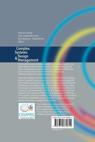 This book contains all refereed papers that were accepted to the sixth edition of the « Complex Systems Design & Management Paris » (CSD&M Paris 2015) international conference which took place in Paris (France) on November 23-25, 2015.These proceedings cover the most recent trends in the emerging field of complex systems sciences & practices from an industrial and academic perspective, including the main industrial domains (aeronautics & aerospace, defense & security, electronics & robotics, energy & environment, health & welfare, software & e-services, transportation), scientific & technical topics (systems fundamentals, systems architecture & engineering, systems metrics & quality, systems modeling tools) and systems types (artificial ecosystems, embedded systems, software & information systems, systems of systems, transportation systems).The CSD&M Paris 2015 conference is organized under the guidance of the CESAMES non-profit organization, address: CESAMES, 8 rue de Hanovre, 75002 Paris, France.