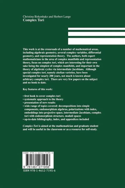 "...Now, whereas the theory of complex abelian varieties has reached a highly advanced stage of its development, after nearly two hundred years of vast and intense research, comparatively few deep results have been known, so far, about the structure and geometry of general complex tori...From what has been said at the beginning of this review, the uniqueness of this first comprehensive monograph on general complex tori, together with its excellent arrangement of the presented material, has already made it a standard text on the subject, and therefore it must be seen as both a really needed and a highly welcome complement to the literature on the related areas of mathematics..." -Zentralblatt Math "Authors have conducted a thorough investigation of these objects. In this volume they present a comprehensive account of their achievements...Containing a great number of new results this monograph will be a standard reference for years to come." --Zentralblatt Math "...general complex tori had a scarce literature so far. This gap is filled by the present book... With its complete up-to-date bibliography the book may serve as both manual and graduate text." --ASM