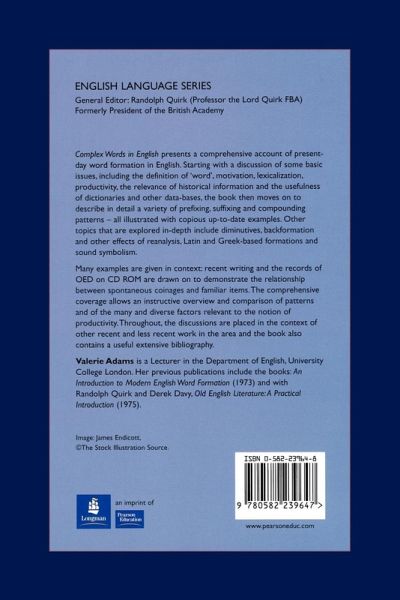 Complex Words in English presents a comprehensive account of present-day word formation in English. Starting with a discussion of some basic issues, including the definition of 'word', motivation, lexicalization, productivity, the relevance of historical information and the usefulness of dictionaries and other data-bases, the book then moves on to describe in detail a variety of prefixing, suffixing and compounding patterns - all illustrated with copious up-to-date examples. Other topics that are explored in-depth include diminutives, backformation and other effects of reanalysis, Latin and Greek based formations and sound symbolism. Many examples are given in context: recent writing and the records of OED on CD ROM are drawn on to demonstrate the relationship between spontaneous coinages and familiar items. The comprehensive coverage allows an instructive overview and comparison of patterns and of the many and diverse factors relevant to the notion of productivity. Throughout, the discussions are placed in the context of other recent and less recent work in the area and the book also contains a useful extensive bibliography. Valerie Adams is a Lecturer in the Department of English, University College London. Her previous publications include the books: An Introduction to Modern English Word Formation (1973) and with Randolph Quirk and Derek Davy, Old English Literature: A Practical Introduction (1975).