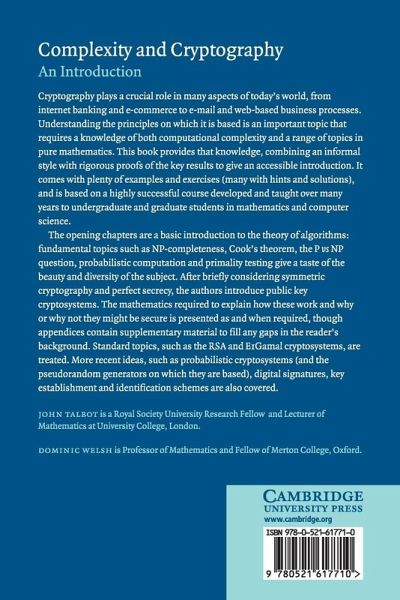 Cryptography plays a crucial role in many aspects of today's world, from internet banking and ecommerce to email and web-based business processes. Understanding the principles on which it is based is an important topic that requires a knowledge of both computational complexity and a range of topics in pure mathematics. This book provides that knowledge, combining an informal style with rigorous proofs of the key results to give an accessible introduction. It comes with plenty of examples and exercises (many with hints and solutions), and is based on a highly successful course developed and taught over many years to undergraduate and graduate students in mathematics and computer science.