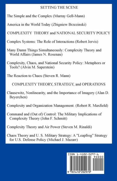SETTING THE SCENE The Simple and the Complex (Murray Gell-Mann) America in the World Today (Zbigniew Brzezinski) COMPLEXITY THEORY and NATIONAL SECURITY POLICY Complex Systems: The Role of Interactions (Robert Jervis) Many Damn Things Simultaneously: Complexity Theory and World Affairs (James N. Rosenau) Complexity, Chaos, and National Security Policy: Metaphors or Tools? (Alvin M. Saperstein) The Reaction to Chaos (Steven R. Mann) COMPLEXITY THEORY, STRATEGY, and OPERATIONS Clausewitz, Nonlinearity, and the Importance of Imagery (Alan D. Beyerchen) Complexity and Organization Management. (Robert R. Maxfield) Command and (Out of) Control: The Military Implications of Complexity Theory (John F. Schmitt) Complexity Theory and Air Power (Steven M. Rinaldi) Chaos Theory and U. S. Military Strategy: A "Leapfrog" Strategy for U.S. Defense Policy (Michael J. Mazarr)