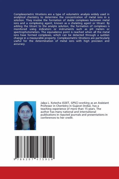 Complexometric titrations are a type of volumetric analysis widely used in analytical chemistry to determine the concentration of metal ions in a solution. They involve the formation of stable complexes between metal ions and a complexing agent, known as a chelating agent or titrant. By adding the titrant to the analyte solution, the formation of complexes is monitored using indicators or instruments such as pH meters or spectrophotometers. The equivalence point is reached when all the metal ions have formed complexes, which can be detected through a sudden change in a measurable property. Complexometric titrations are particularly useful for the determination of metal ions with high precision and accuracy.